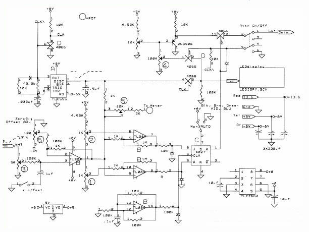 The S-meter comes into pot 3; this is used to trim the full-scale voltage of the s-meter so that it corresponds to full scale on the led meter. This goes to a buffer amp, so as to not load down the s-meter circuit in the 751. The buffer has another input, that is use to set the zero signal level at the first led. The output of this amp goes through a 1K resistor to an analog gate 4066 pin 4. Also it goes to the .5uf (.47uf) cap that is held to ground until TLC555 pin 7 lets it go (note: must use the CMOS versions of the 555 NOT the LM555). The output is /clk and also goes to a 4066 inverter to produce a clk signal. The attenuation control voltage is varied by the 10K 10-turn pot (not numbered). This signal goes through an emitter follower 2N3906; this signal goes to an analog gate 4066 pin 11. This gate turns off the attenuation voltage going to the 751, when it is not needed. The TL084 is a quad op-amp chip, one of the amps (pins 12,13,14) is used as a clock for the 4027-control toggle, and this clock runs at about 1HZ. The two other are used as level detectors. The lower one serves, as the point where the attenuator will turn off, and the upper one determines at what level the attenuator will kick in. In between the attenuation will stay as set. I set mine at about 15-20% and above 90%. The 4027 toggle will toggle to the state that these two level detectors dictate. Down in the lower right corner is a capacitive level converter that produces the negative voltages necessary for the proper operation of the op-amps. (Note: you might choose to use a rail-to-rail op-amp and maybe not need the negative voltage converter 7662). The buffer amp also can drive an analog meter through the pot 5 and 3K, if you want. Also on the input a fast/slow switch slows the signal down a bit when heavy modulation may cause bouncing of the s-meter.