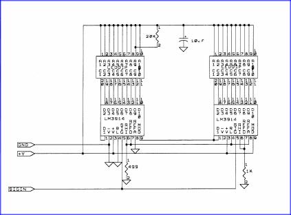 The reason behind designing an automatic attenuator is that too many times I've passed by a lower powered transmitter, because I forgot to turn off the attenuation being used on the stronger signal. This attenuator uses the front end of the radio used to control the gain of the first stages. The radio that I use is the Kenwood TR-751A. This could also be used on other type radios, but would require some changes to the control voltages used. At a minimum 3 wires need to come from the radio. Ground, S-meter signal, and the gain control voltage going back to the radio. I use more; available in the radio are several voltages that can be used with this setup. +13.6 switched, +8V, -8V. In the attenuator that I'm going to explain, I only use the +8V and I generate the -8V internally. I use twenty Led display, but any amount of Led’s can be used. Just adjust the circuitry appropriately. The Led display actually does several things, it of course shows the relative strength of the signal, but it also shows the relative setting of the attenuator. The Led display uses the LM3914 Led driver.