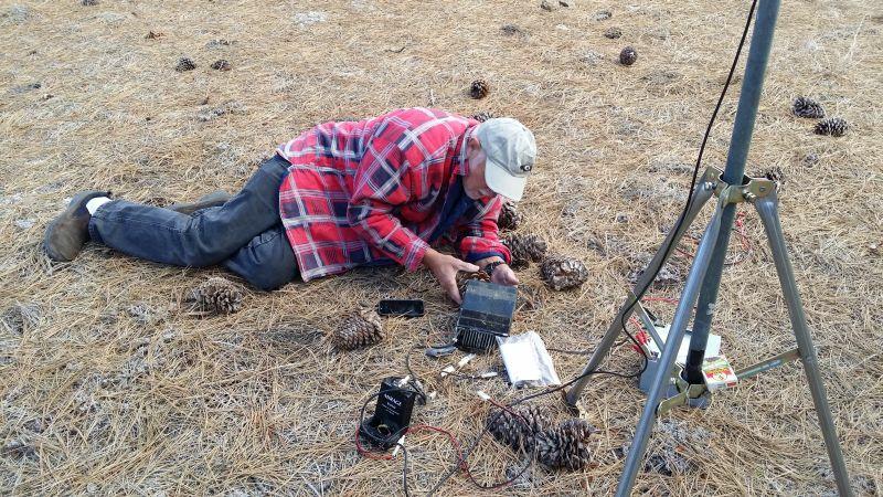 T2 (the close in one) was about 16 miles from the start. I believe most hunters went by it, and had to come back to find it. The second (3rd. 4th, and 5th) T's where about 101 miles from the start. They where located on Pinos Mt. This wasn't our first choice, but conditions made the hide there necessary. T3 the main T at Pinos, was running 20 watts into an Elk log periodic beam vertical polarized. We had T14, a 50mw squab, a 5mw "Snake" T, and a 3 watt T9 running into a 1/4 vertical (which was heard by two hunters at T2 location). By the way the main T was at about 8000'! It was cold; there was token snow (for those who hadn't seen snow since last year). When I went to retrieve the T's Sunday morning at 9; 30am, all but the T14 was still transmitting. T14 was running at 7:30pm the night before, because Jippy was able to hear it.