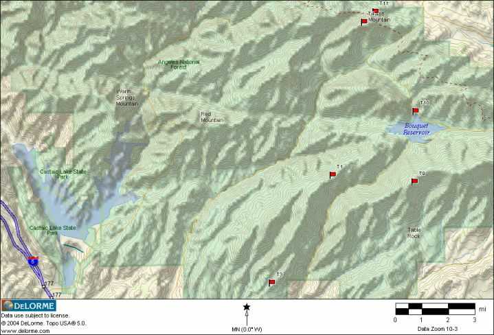 T9 (5 mW, vert, 11-element beam) was 6 miles up the southern end of 6N07 from Bouquet Cyn and was on the east side of the ridge. The idea I was going for was to reduce the output power, aim the signal toward the 5/14 interchange and not have it heard at T1. T4 (300 mW, duckie) was on Grass Mt. T11 (50 mW, duckie) was near by on 6N04 a little farther past the cut off to Grass Mt. T10 (50 mW duckie) was in at a small turn out at the north end of Bouquet Reservoir.