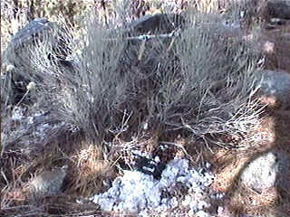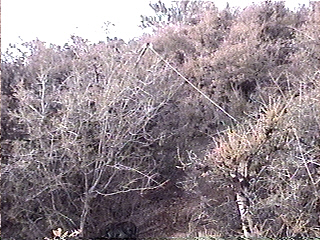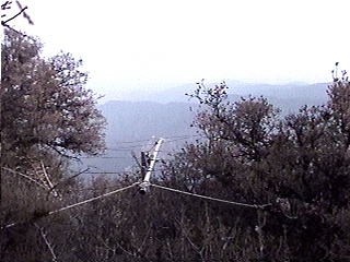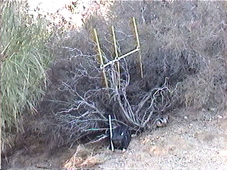 KG6KZF (David) and myself headed out mid afternoon on Friday to hide T1 & T3. We arrived at Cuyama Peak (south of Hwy 166 and west of Hwy 33 and in Santa Barbara county) about 5 PM. What we didn't know was that Mr. Murphy had tagged along. We found a spot on the west side and about 100 feet or so below the peak (where an old forest lookout remains) to hide the 4 watt T1. This might shield the direct signal from Mt. Pinos. After working our way though the brush that had fish-hook like leaves and grabbed everything (rope, coax, shirts, pants, etc), we pointed the 11-element beam toward the starting point and Reyes Peak. The beam had been recently acquired from a friend that was moving and the beam had been on his tower for several years. The idea was to have a good signal at the starting point and have a bounce off Reyes Peak for those hearing the signal on Mt. Pinos.