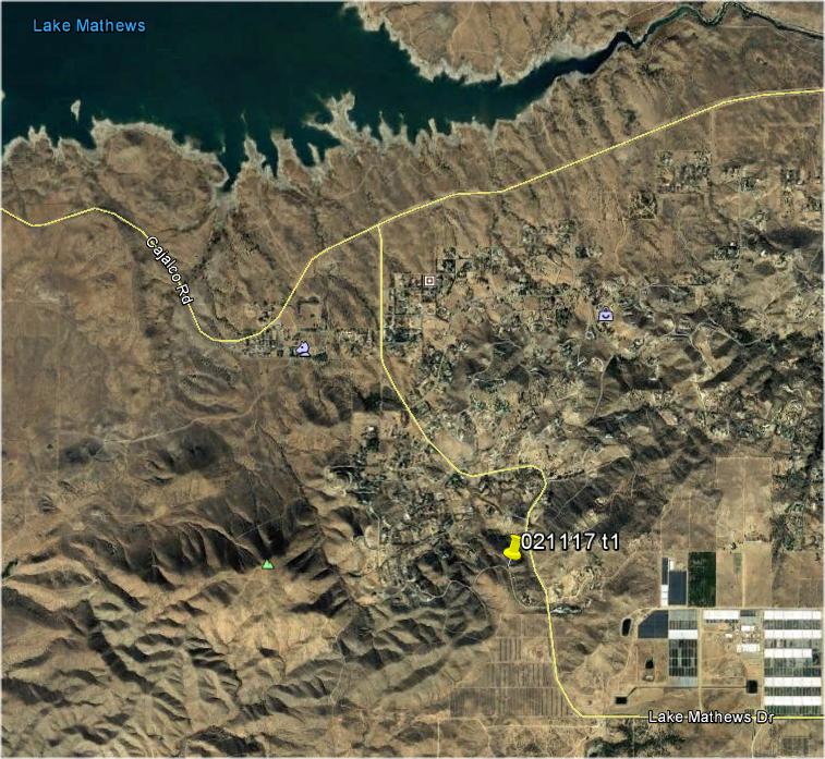 There were 2 T’s hidden.  T2 was very weak and could only be heard from T1 .  It was located north of T1 on the opposite side of Lake Mathews.  I disqualified it from the hunt.  T1 (which everybody found) was located at  33°48'9.29"N, 117°24'17.34"W on a pad in Gavalin Hills.